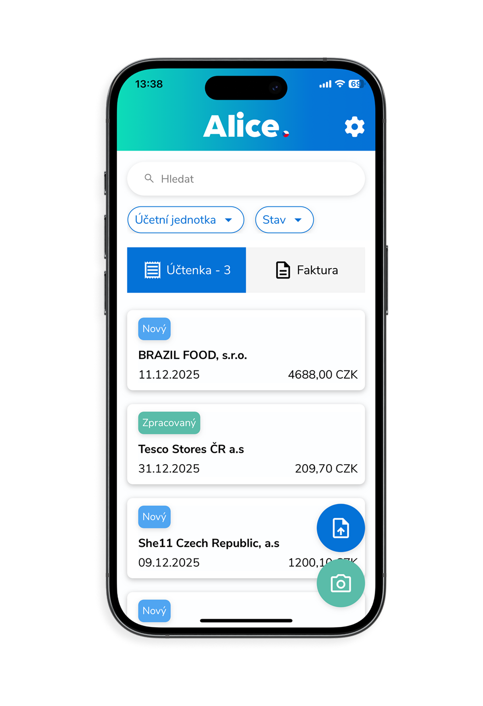 Kromě uživatelsky příjemné webové aplikace jako první v republice přinášíme mobilní aplikaci na vytěžování dokladů. Mobilní aplikace Alice je ke stažení zdarma na Android a iOS pro všechny uživatele.